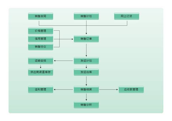 以销售订单为中心,对制药企业销售全过程进行实时监控和管理。结合价格管理、信用管理,实现销售协议、销售合同和销售订单管理;在此基础上进行发运管理和渠道管理,通过终端管控,实现销售对生产、采购的精确引导;严控销售结算和应收管理,实现资金控制与回流。最后,通过对销售数据进行全面分析,为公司的资源调配提供决策依据,为未来的市场变化提供预测分析。